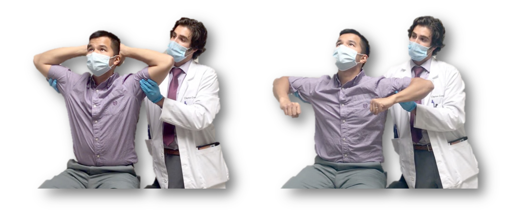 Crowing rooster maneuvers to attempt recreating or worsening pain associated with costochondritis: Left picture: with patient’s hands clasped behind their head; Right picture: with patient’s arms raised to their sides. With each maneuver, patients are asked to extend their neck (look upward) while the helping party gently lifts the arms superiorly and posteriorly. Reproduction of bilateral costochondral pain will occur. (Mott, et al.)