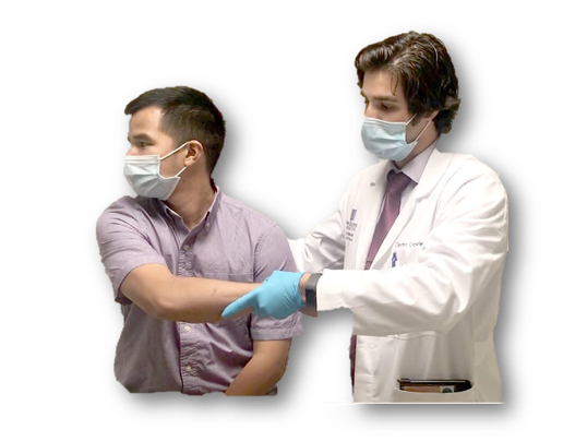Crossed-chest adduction maneuver to attempt recreating or worsening pain associated with costochondritis. The patient is asked to turn their head toward one shoulder. Bring the patient’s ipsilateral arm across the chest with gentle, but continuous, pressure. This can be repeated with the opposite shoulder and arm, with the head turned to that side to assess for reproduction of bilateral costochondral pain. (Mott, et al.)